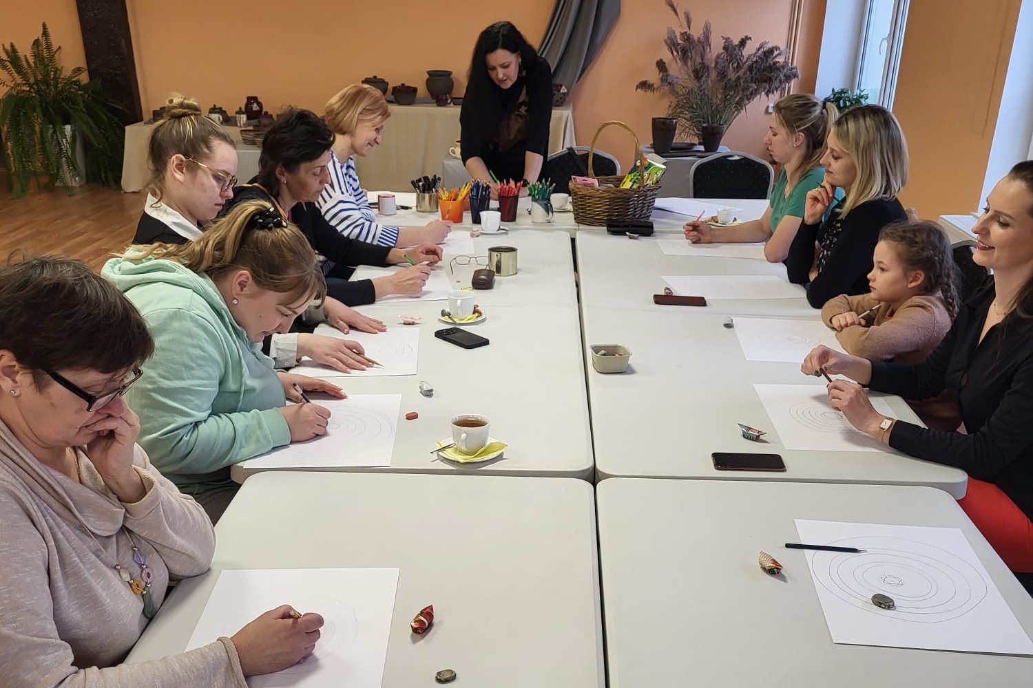 Nodarbības vadītāja Rudīte Kaša ar sievišķīgu eleganci, pieskaroties meditatīvās zīmēšanas teorētiskajam pamatojumam, iedrošināja, uzsverot katras dalībnieces veiktā darba saistību ar viņu pašu, gan izvēlēto krāsu, gan līniju apstrādes izvēli. Zīmējot apļus un darbojoties ar līnijām, ieviešot vēlamo krāsu gammu, kas konkrētā brīdī uzrunā, iedziļinoties sevī un atļaujot rokai veikt zīmējumā korekcijas tiecoties uz skaisto, katra no nodarbības dalībniecēm radīja darbu, kas izteica viņas iekšējo būtību. Noslēgumā dalībnieces pastāstīja par veikto darbošanās procesu, saskatīja attēlotā saistību ar sevi.
