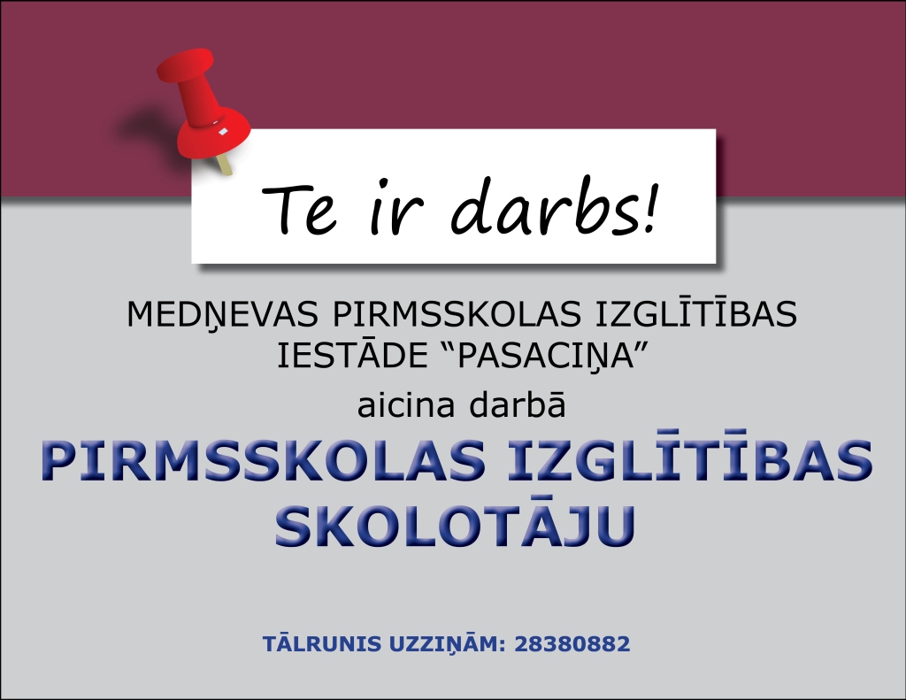 Balvu novada pašvaldības Medņevas pirmsskolas izglītības iestāde “Pasaciņa” aicina darbā pirmsskolas izglītības skolotāju