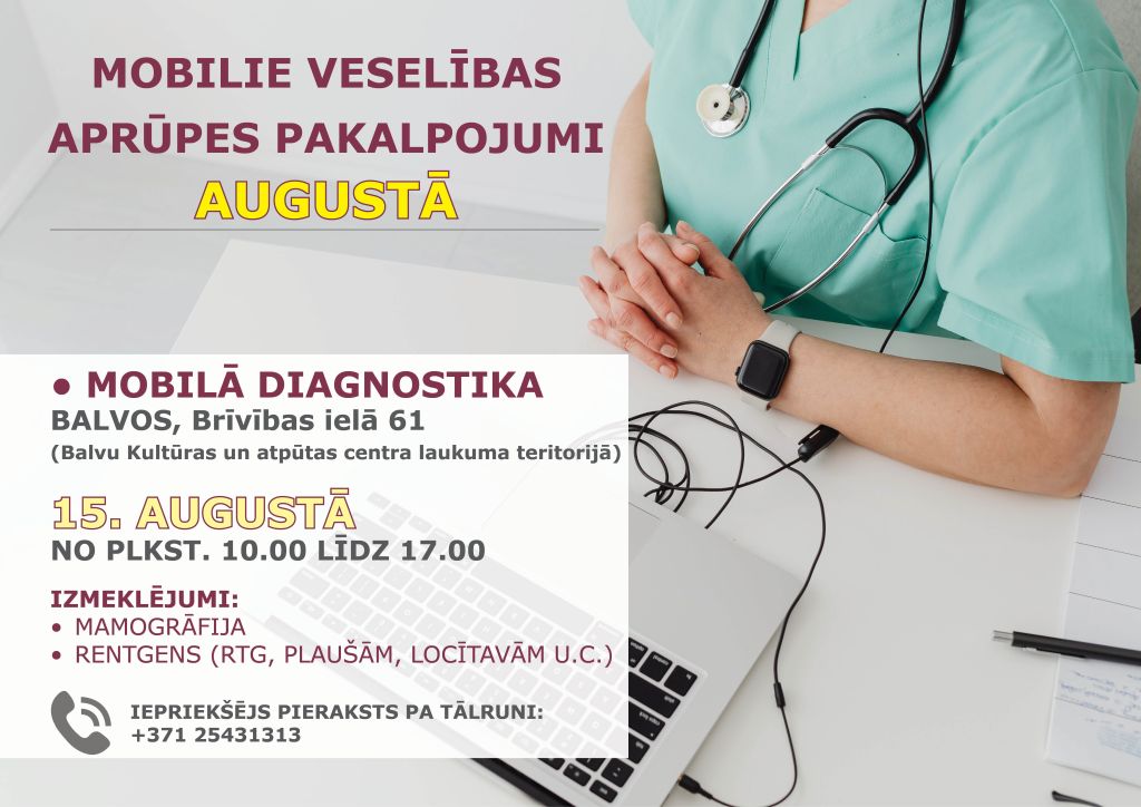 15. augustā no plkst. 10.00 līdz 17.00 Balvos būs pieejami izbraukuma izmeklējumi.