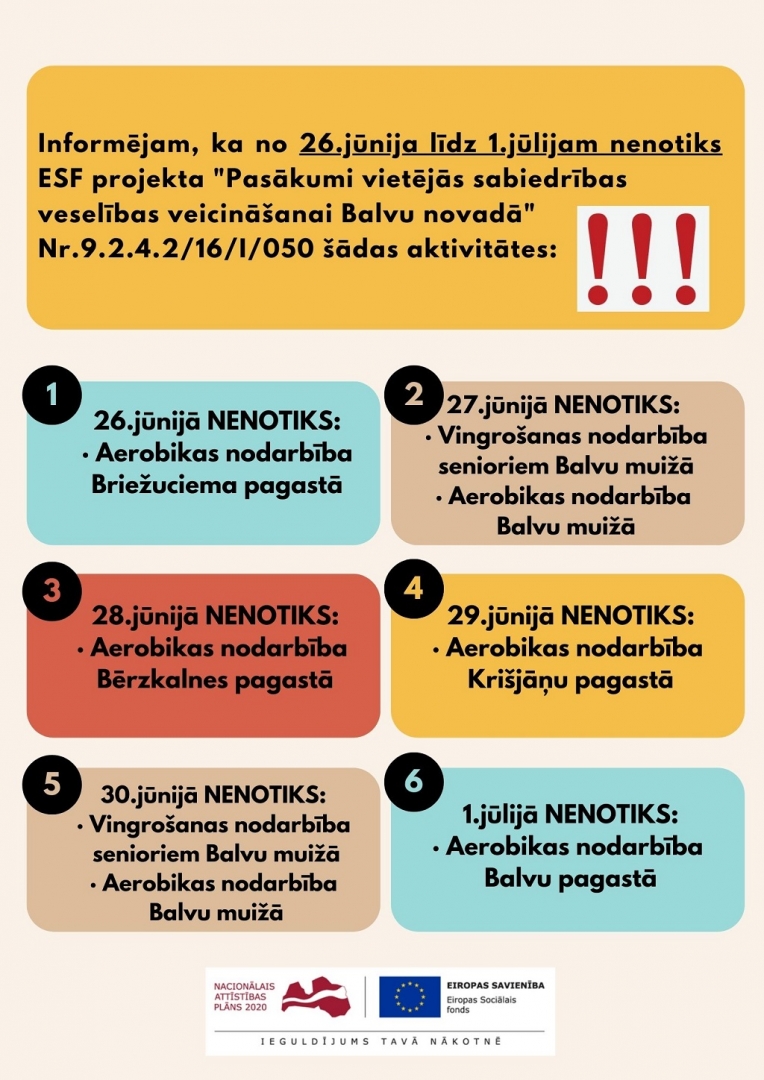 Informējam, ka no 26.jūnija līdz 1.jūlijam nenotiks ESF projekta "Pasākumi vietējās sabiedrības veselības veicināšanai Balvu novadā" Nr.9.2.4.2/16/I/050 šādas aktivitātes: