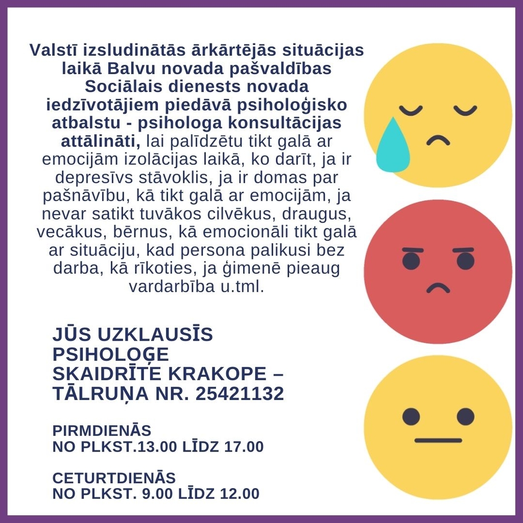 Valstī izsludinātās ārkārtējās situācijas laikā Balvu novada pašvaldības Sociālais dienests novada iedzīvotājiem piedāvā psiholoģisko atbalstu - psihologa konsultācijas attālināti, lai palīdzētu tikt galā ar emocijām izolācijas laikā, ko darīt, ja ir depresīvs stāvoklis, ja ir domas par pašnāvību, kā tikt galā ar emocijām, ja nevar satikt tuvākos cilvēkus, draugus, vecākus, bērnus, kā emocionāli tikt galā ar situāciju, kad persona palikusi bez darba, kā rīkoties, ja ģimenē pieaug vardarbība u.tml.