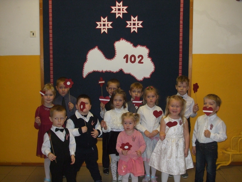 Valsts 102. gadadienu sagaidot, bērni bija iemācījušies vairākas tautasdziesmas un dziesmas. Dziedājām Latvijas valsts himnu "Dievs svētī Latviju". Kopā ar mūzikas skolotāju mācījāmies un izspēlējām arī latviešu tautas rotaļas.