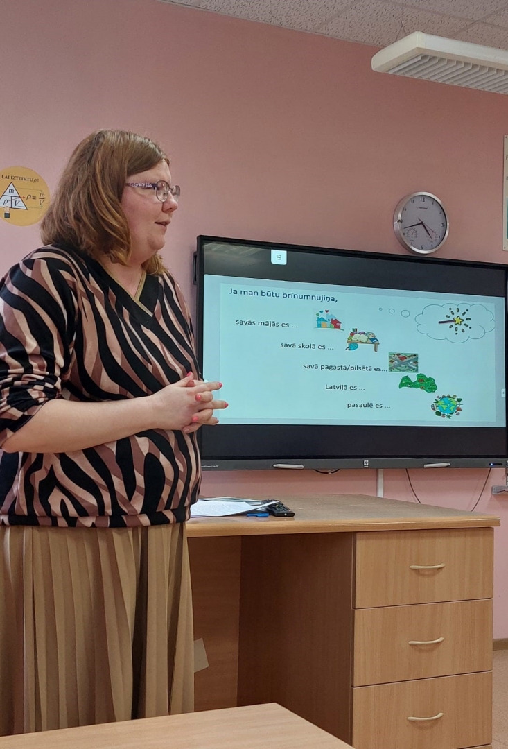 Mācību laikā Balvu Valsts ģimnāzijas skolotāja Laura Saulīte Rugāju vidusskolas skolotājiem pastāstīja par Izglītības attīstības centra projektu “Satikt”.