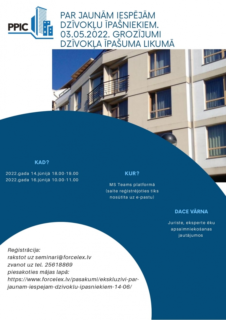 Reģistrācija: rakstot uz seminari@forcelex.lv , zvanot uz tel. +371 25618869 vai piesakoties mājas lapā: https://www.forcelex.lv/pasakumi/ekskluzivi-par-jaunam-iespejam-dzivoklu-ipasniekiem-14-06/