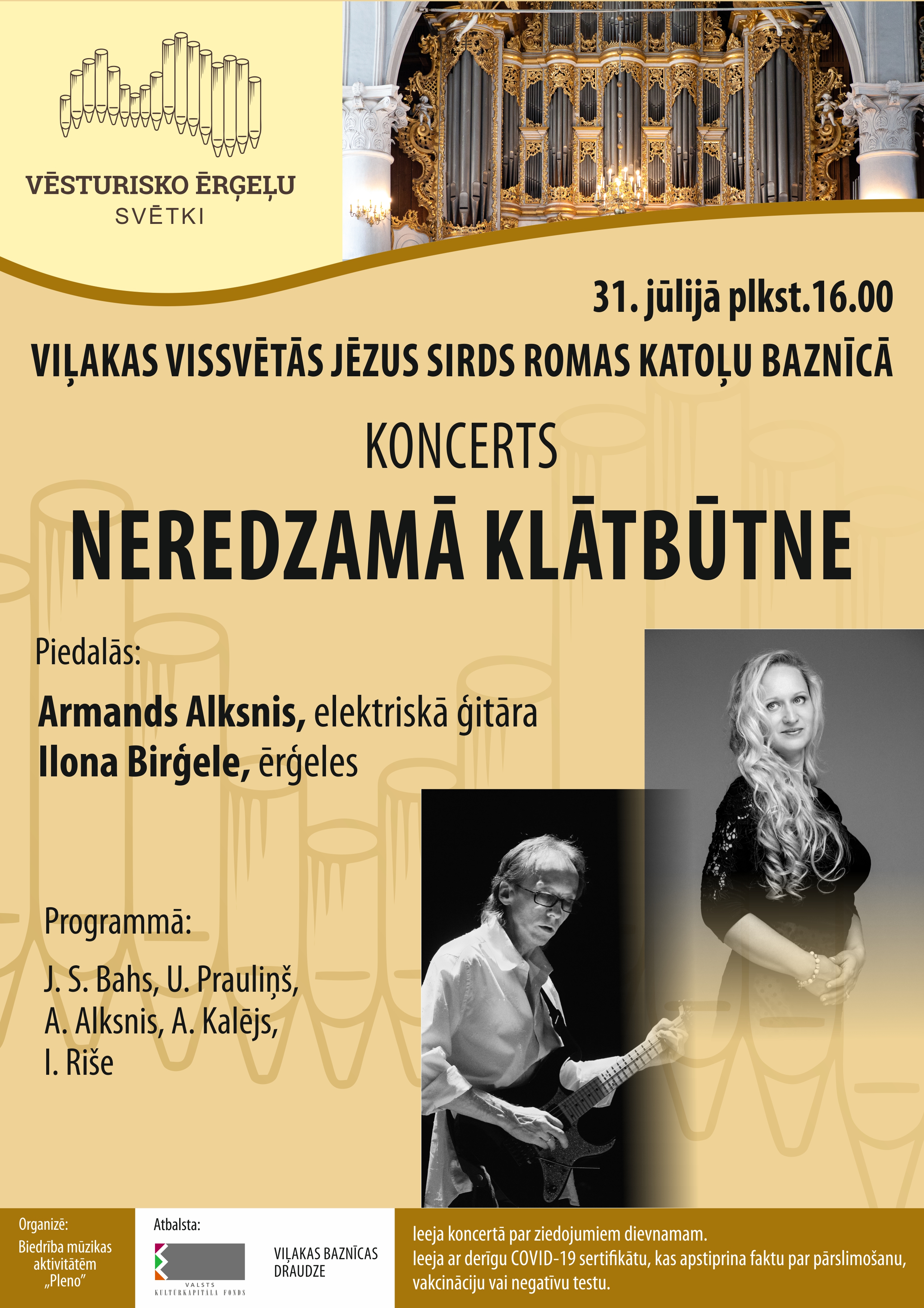 Koncerts “Neredzamā klātbūtne” notiks 31.jūlijā plkst.16:00 Viļakas Vissvētās Jēzus Sirds Romas katoļu baznīcā. Šajā koncertprogrammā ir satikušies divi spilgti un ievērojami mākslinieki – ērģelniece Ilona Birģele un ģitārists, ilggadējs ansambļa ”Credo” mūziķis Armands Alksnis. Šī ir jau trešā mūziķu kopīgi veidotā programma. Līdzšinējā sadarbība guva ievērojamu atzinību gan klausītāju, gan mūzikas speciālistu vidū, un māksliniekiem radās iedvesma turpināt iesākto ceļu.