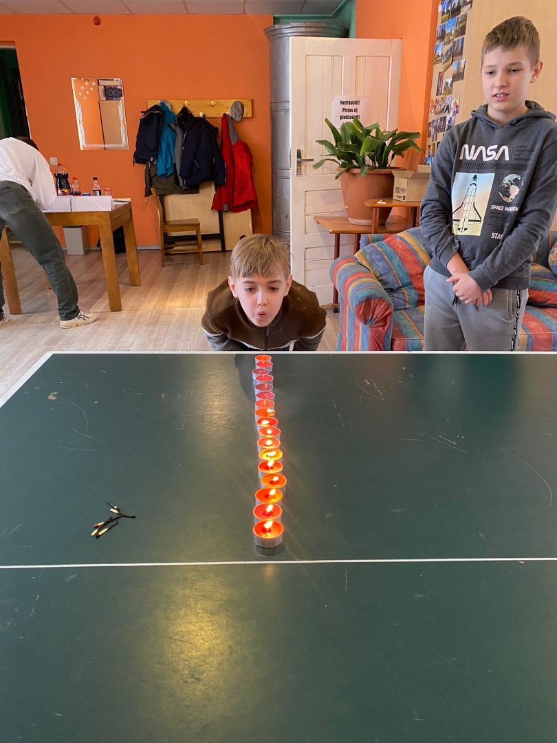 Ar pēdējo spēli mēs katrs vismaz reizi jau esam saskārušies. Spēles “Nopūt svecītes” uzdevums bija “gandrīz” vienkāršs. Vienā rindā bija saliktas iedegtas svecītes un katram bija vienā elpas vilcienā jānopūš visas liesmiņas. Varētu jautāt, kas tur ir tik sarežģīts? Mums arī šķita, ka šis būs vieglāk par vieglu, bet kad katrs centās nopūst visas svecītes un šķita, ka visas ir nodzisušas, dažas pēkšņi atkal iedegās, atstājot dalībnieku ar izbrīnītu seju. Laiks paskrēja nemanot, jo mazais sacensību gars neļāva jauniešiem atslābt, katrs vēlējās uzlabot savu rezultātu izaicinājumos un pārspēt citus. Paldies mūsu kolosālajiem brīvprātīgajiem Šarlotei un Ērikam, kas aktīvi līdzdarbojas Semenovas Jauniešu mājā katru trešdienu.
