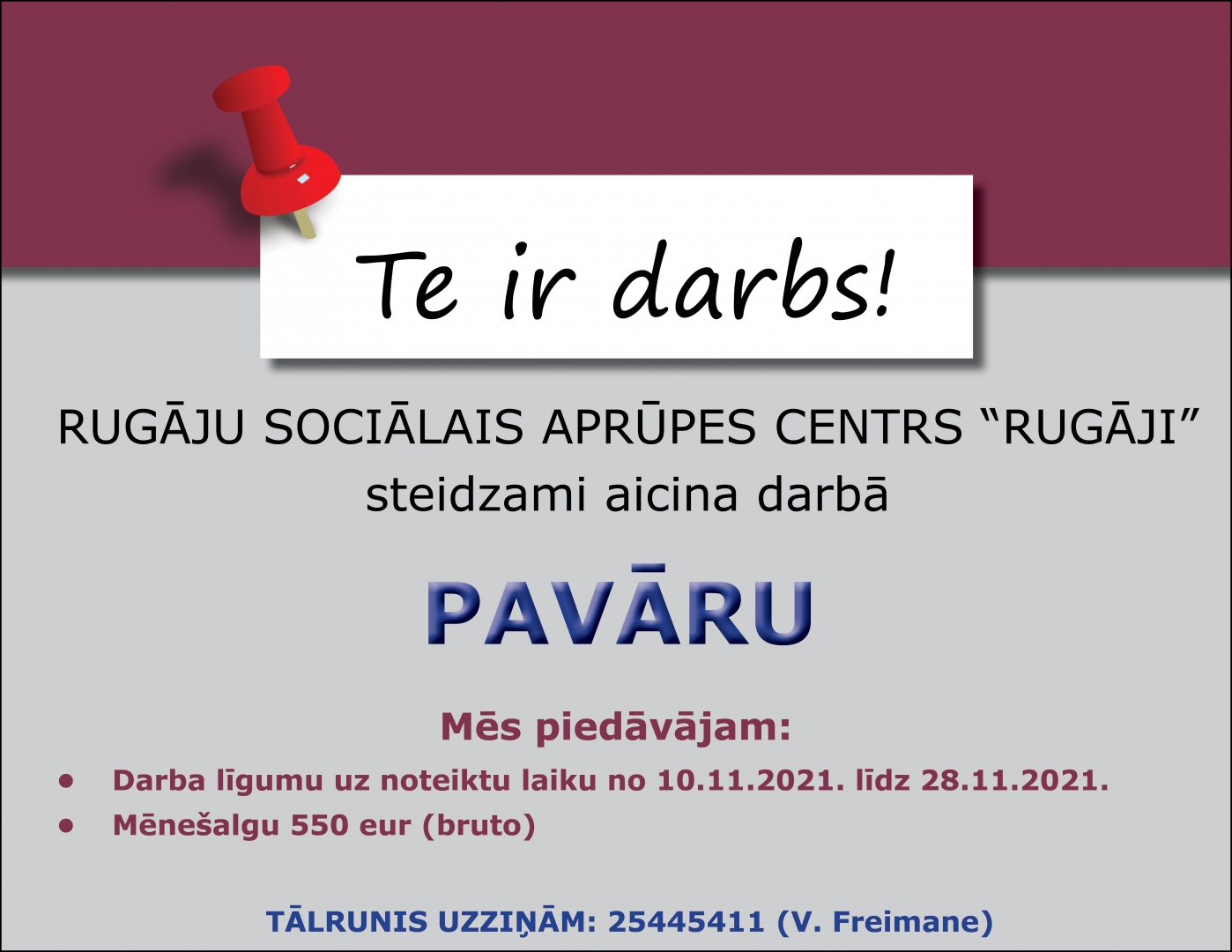 - Darba līgumu uz noteiktu laiku no 10.11.2021. līdz 28.11.2021.;