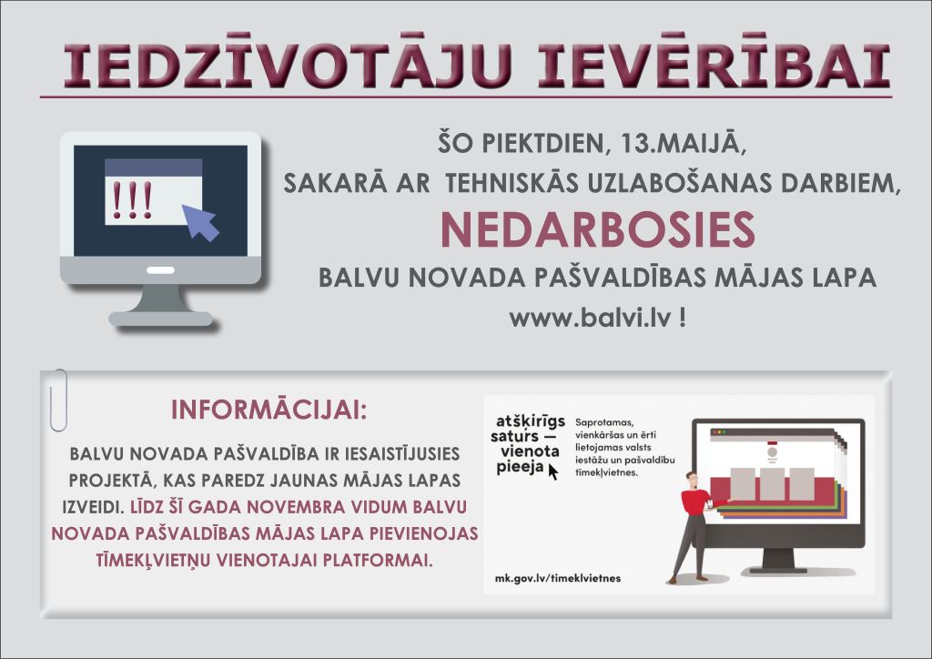 Sakarā ar Balvu novada pašvaldības mājas lapas www.balvi.lv tehniskās uzlabošanas darbiem, šo piektdien, 13.maijā, NEDARBOSIES mājas lapa.