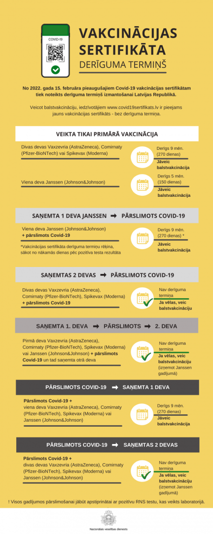 Omikrona varianta straujās izplatības dēļ un, lai mazinātu plašas COVD-19 infekcijas izplatību, Latvijā ir noteikts primārās vakcinācijas sertifikāta derīguma termiņš. Valdība 6. janvārī apstiprināja grozījumus Ministru kabineta noteikumos, nosakot, ka Covid-19 vakcinācijas sertifikātu derīguma termiņš Latvijā stāsies spēkā 15.februārī un attieksies uz pakalpojumu saņemšanu un pasākumu apmeklēšanu epidemioloģiski drošā vidē, kur nepieciešams uzrādīt sadarbspējīgu vakcinācijas sertifikātu. Vakcinācijas derīguma termiņš netiek attiecināts uz personām līdz 18 gadiem, jo šai iedzīvotāju grupai balstvakcinācija pašlaik nav nepieciešama. Darba pienākumu veikšanai joprojām saglabājas prasība pēc pabeigtas primārās vakcinācijas un balstvakcinācija tiek stingri rekomendēta.