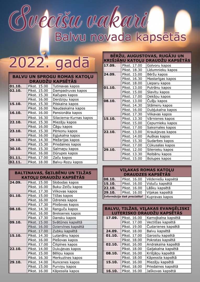 Informācijas papildinājums- 16.oktobrī plkst.12.00 Sv.Mise Kupravas katoļu baznīcā, plkst.14.00 Svecīšu vakars Kupravas kapsētā.