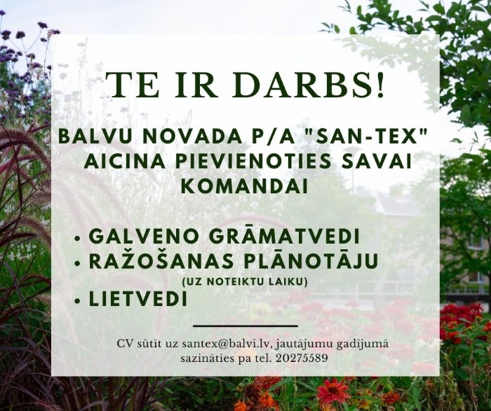 Balvu novada pašvaldības aģentūra “San-Tex” (Reģ.Nr. LV90001663120) aicina pievienoties savai komandai: