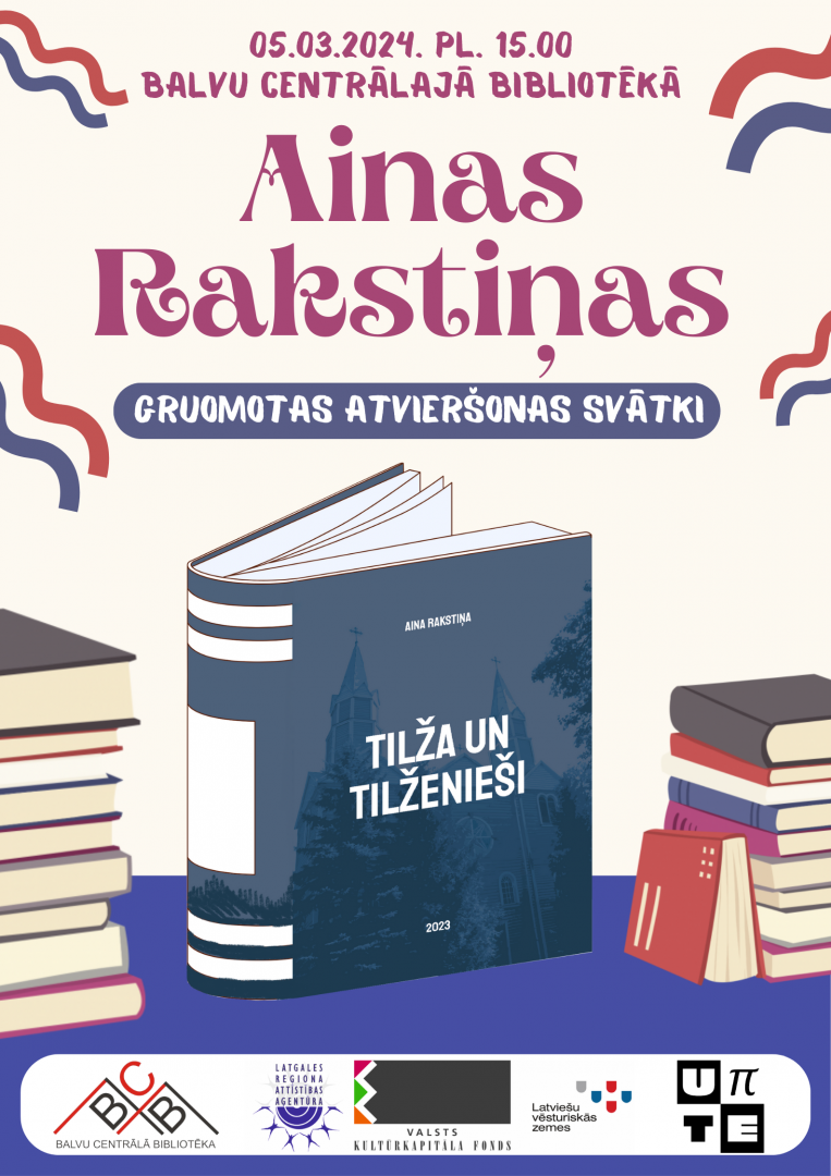 5. martā pulksten 15.00 Balvu Centrālajā bibliotēkā tiks svinēti Ainas Rakstiņas grāmatas “Tilža un tilženieši” atklāšanas svētki. Autore šo grāmatu rakstījusi, un Balvu novada Tilžas ciema vēsturi un stāstus par tās iedzīvotājiem ir apkopojusi daudzu gadu garumā, strādājot par vēstures skolotāju Tilžas skolā. Daudzu gadu neatlaidīgs darbs ir vainagojies ļoti vērtīgā un izzinošā vairāk kā 300 lappušu biezā grāmatā.