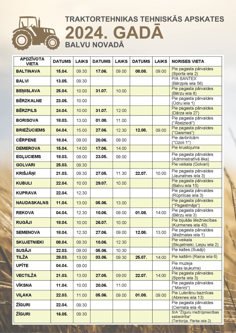Lai piedalītos ceļu satiksmē, t. sk., arī pirms pavasara darbu uzsākšanas, traktortehnika un tās piekabes jāsagatavo un jāuzrāda ikgadējai tehniskajai apskatei. Apskates laikā vadītājam jābūt līdzi derīgai atbilstošas kategorijas traktortehnikas vadītāja apliecībai, tehnikas reģistrācijas apliecībai un jābūt derīgai OCTA polisei.