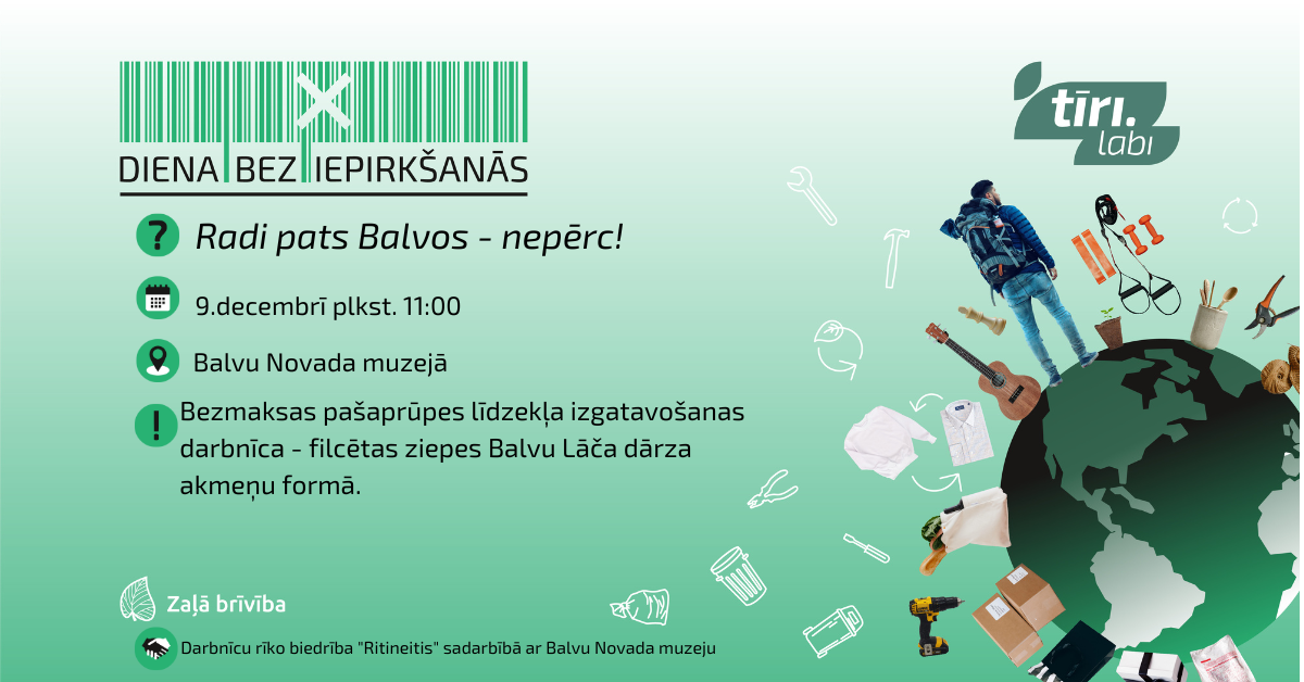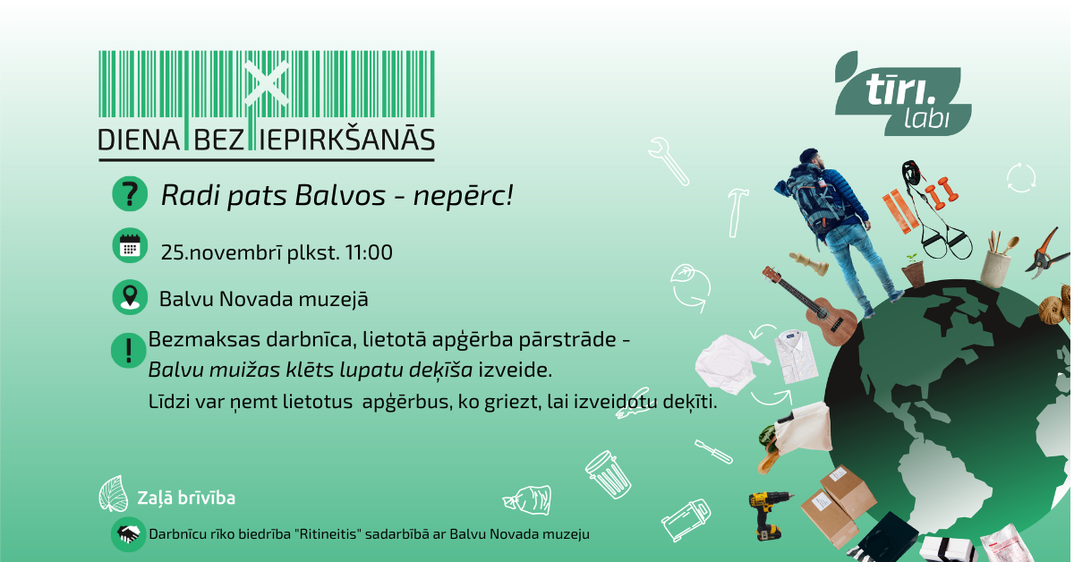 Biedrība "Ritineitis" sadarbībā ar Balvu Novada muzeju piedalās biedrības "Zaļā brīvība" iniciatīvā "Tīri. Labi. Diena bez iepirkšanās”. Trīs sestdienas aicinām uz BEZMAKSAS darbnīcām "RADI PATS BALVOS - NEPĒRC!" Balvu Novada muzejā.