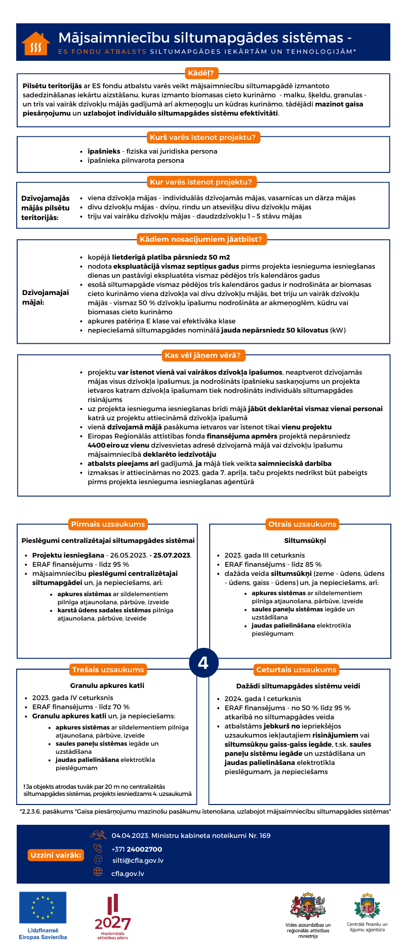- Pasākuma mērķis ir samazināt gaisa piesārņojuma radīto negatīvo ietekmi uz vidi un cilvēku veselību, aizstājot mājsaimniecību sektora dzīvojamās mājās siltumapgādē izmantotās sadedzināšanas iekārtas, uzlabojot individuālo siltumapgādes sistēmu efektivitāti, ieviešot siltumapgādes iekārtas un tehnoloģijas, kas būtiski samazina gaisa piesārņojumu, tai skaitā dzīvojamās mājas pieslēdzot efektīvām centralizētajām pilsētu siltumapgādes sistēmām, kas ir pirmā uzsaukuma mērķis.