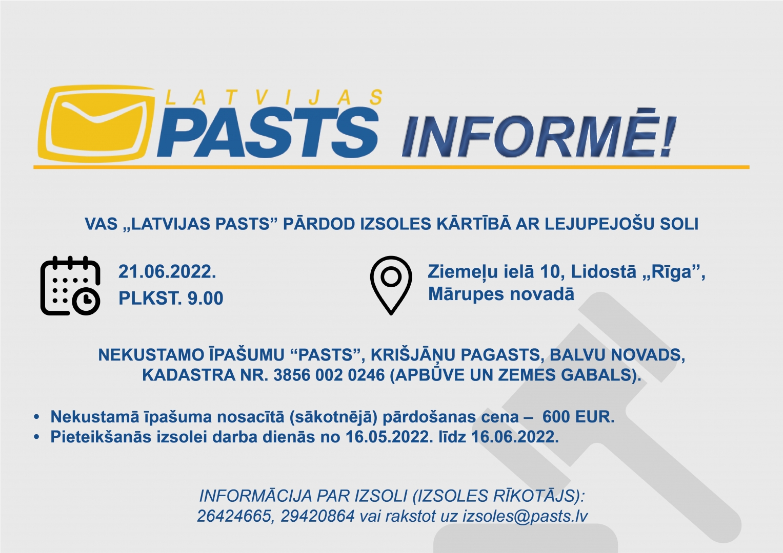 VAS „Latvijas Pasts” pārdod izsoles kārtībā ar lejupejošu soli (21.06.2022., plkst. 9:00, Ziemeļu ielā 10, Lidostā „Rīga”), Mārupes novadā, nekustamo īpašumu “Pasts”, Krišjāņu pagasts, Balvu novads, kadastra Nr. 3856 002 0246 (apbūve un zemes gabals). Nekustamā īpašuma nosacītā (sākotnējā) pārdošanas cena – 600 EUR.