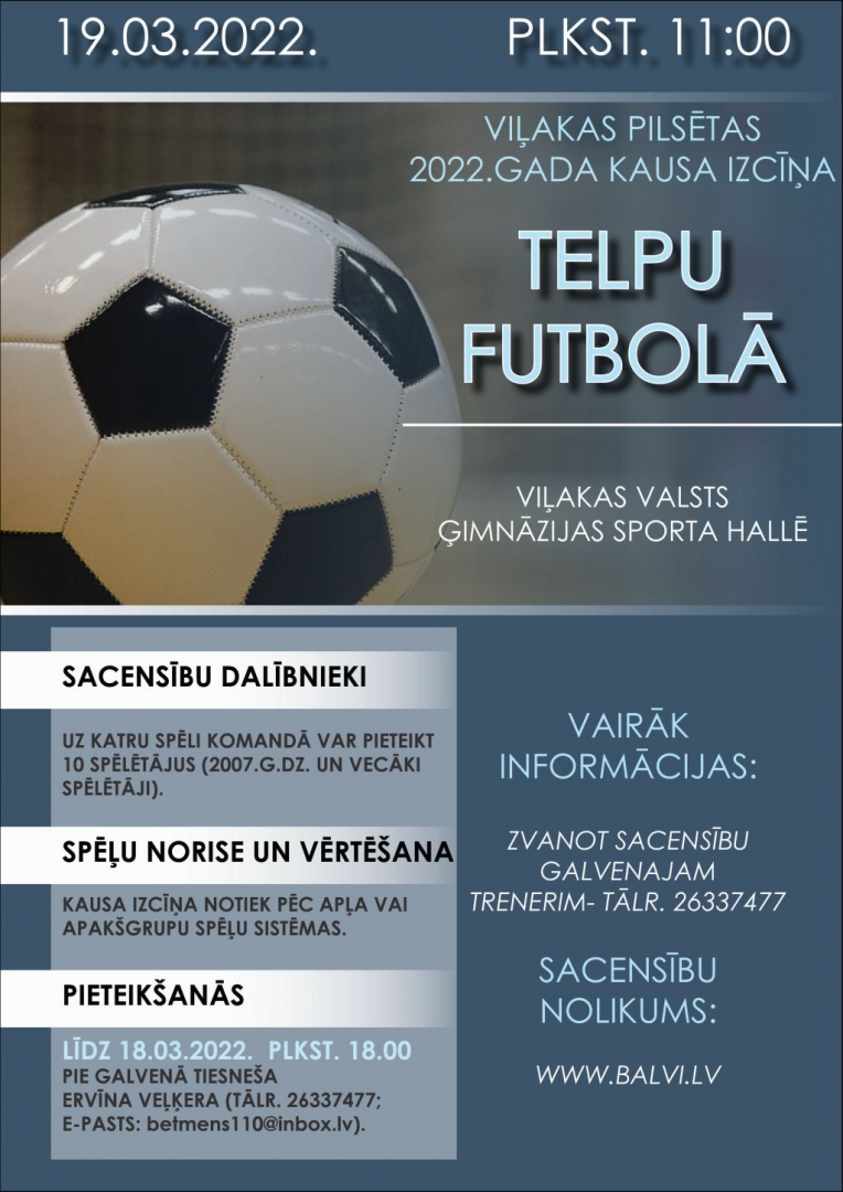 2022 .g. 19. martā Viļakas Valsts ģimnāzijas sporta hallē notiks Viļakas pilsētas 2022.gada kausa izcīņa telpu futbolā.