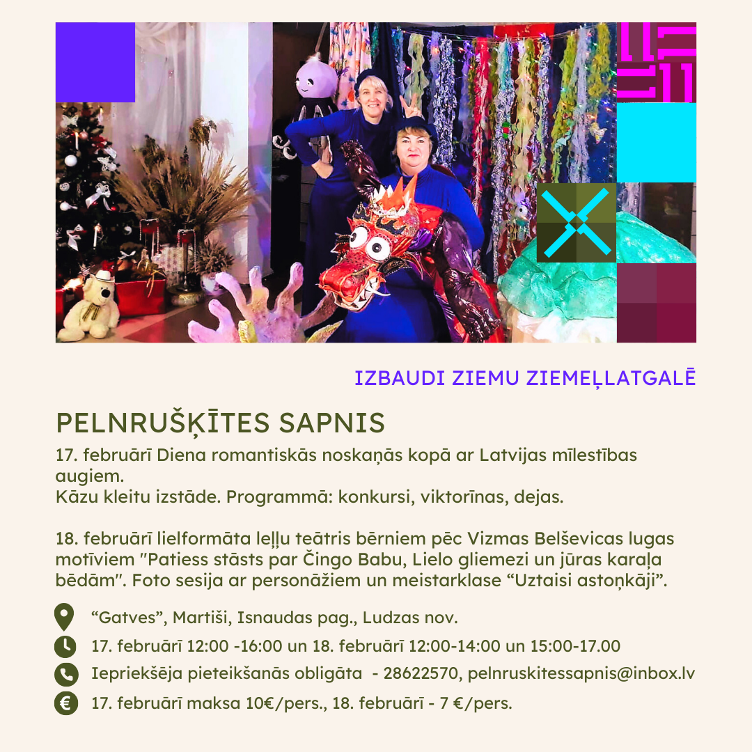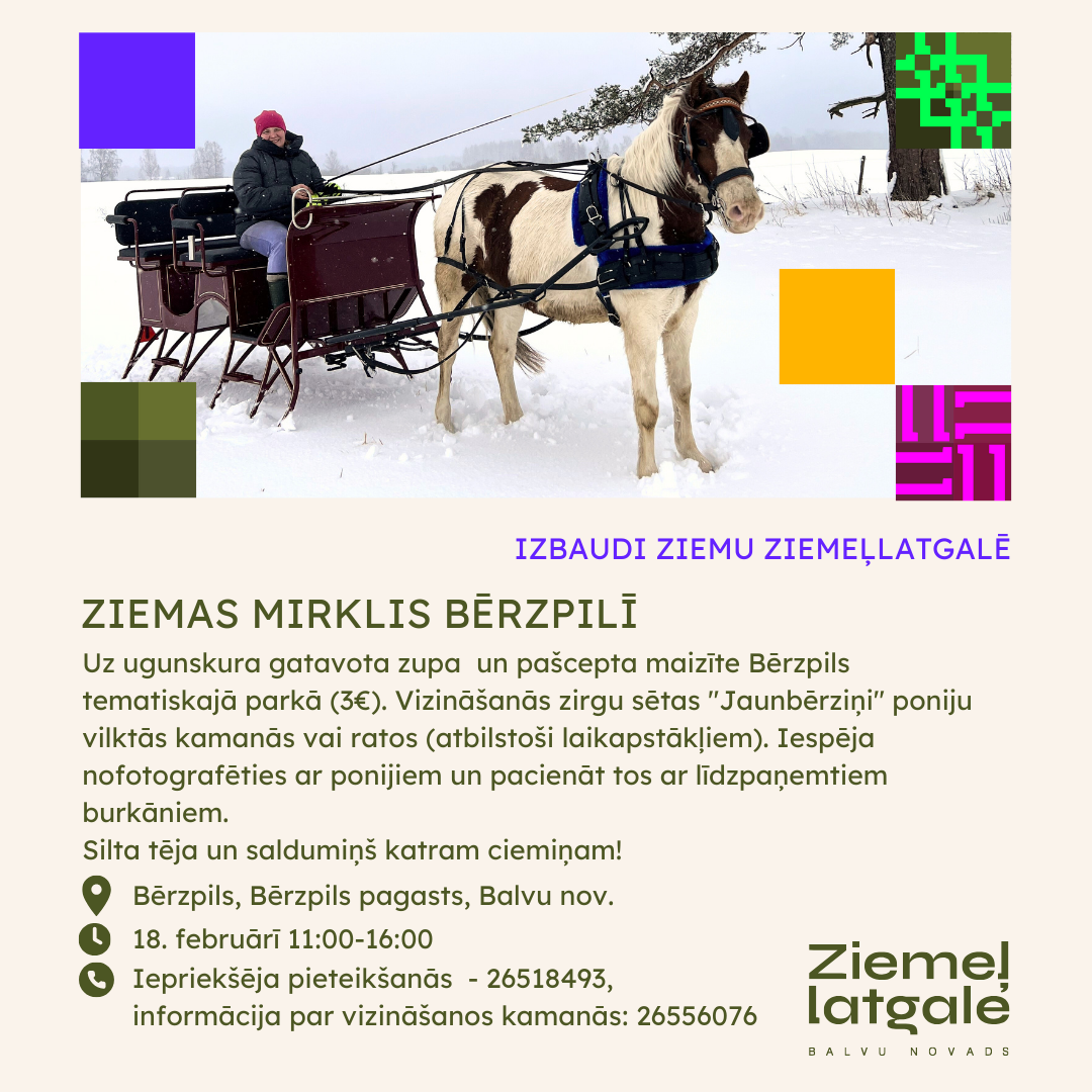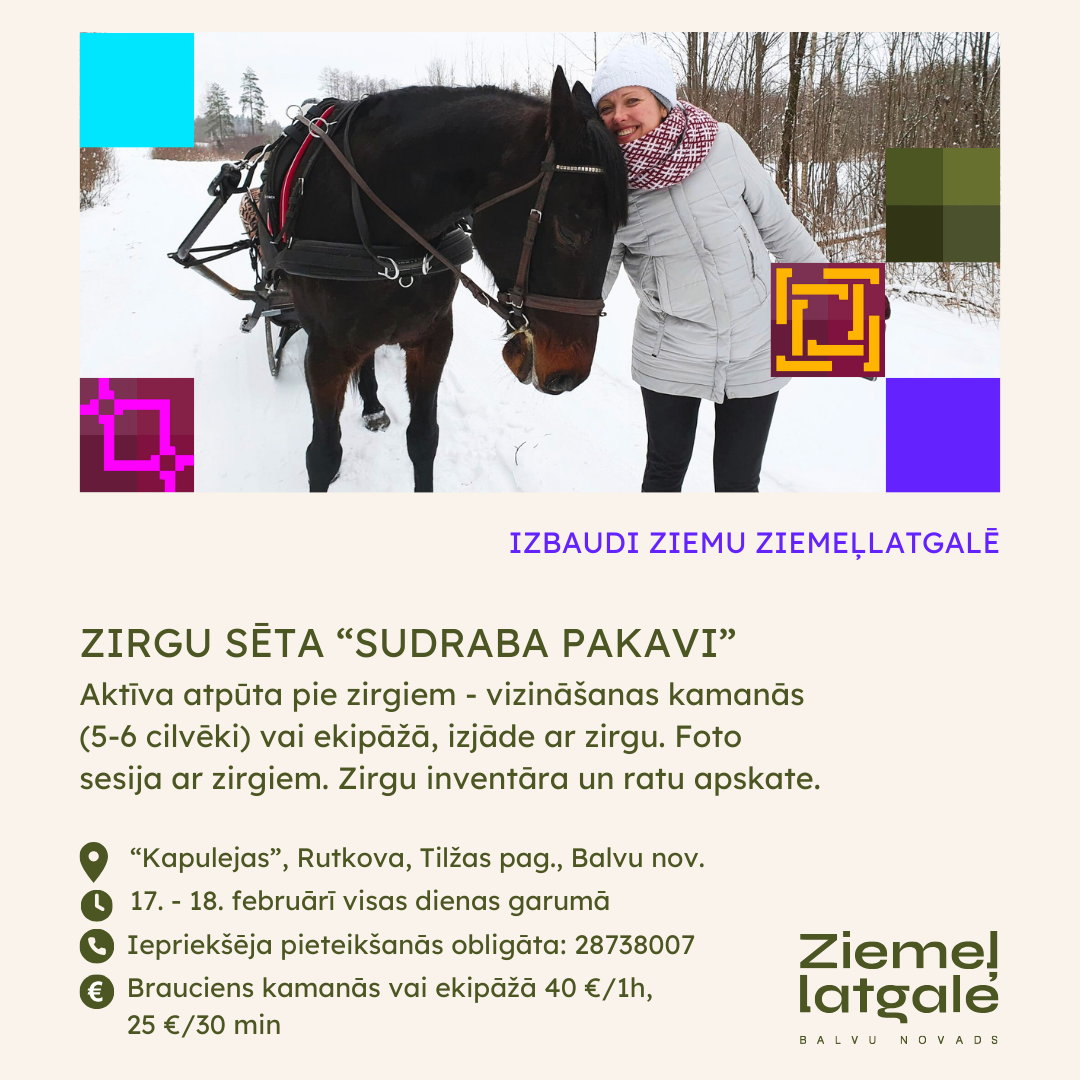 Divu dienu garumā dažādos Ziemeļlatgales tūrisma objektos, kultūrvietās un dabā daudzveidīgas aktivitātes un pasākumi, lai vietējiem iedzīvotājiem un reģiona viesiem piedāvātu apmeklēt Ziemeļlatgali arī ziemas sezonā – dosimies pārgājienos, vizināsimies zirga kamanās, radoši darbosimies, baudīsim kulināros gardumus!