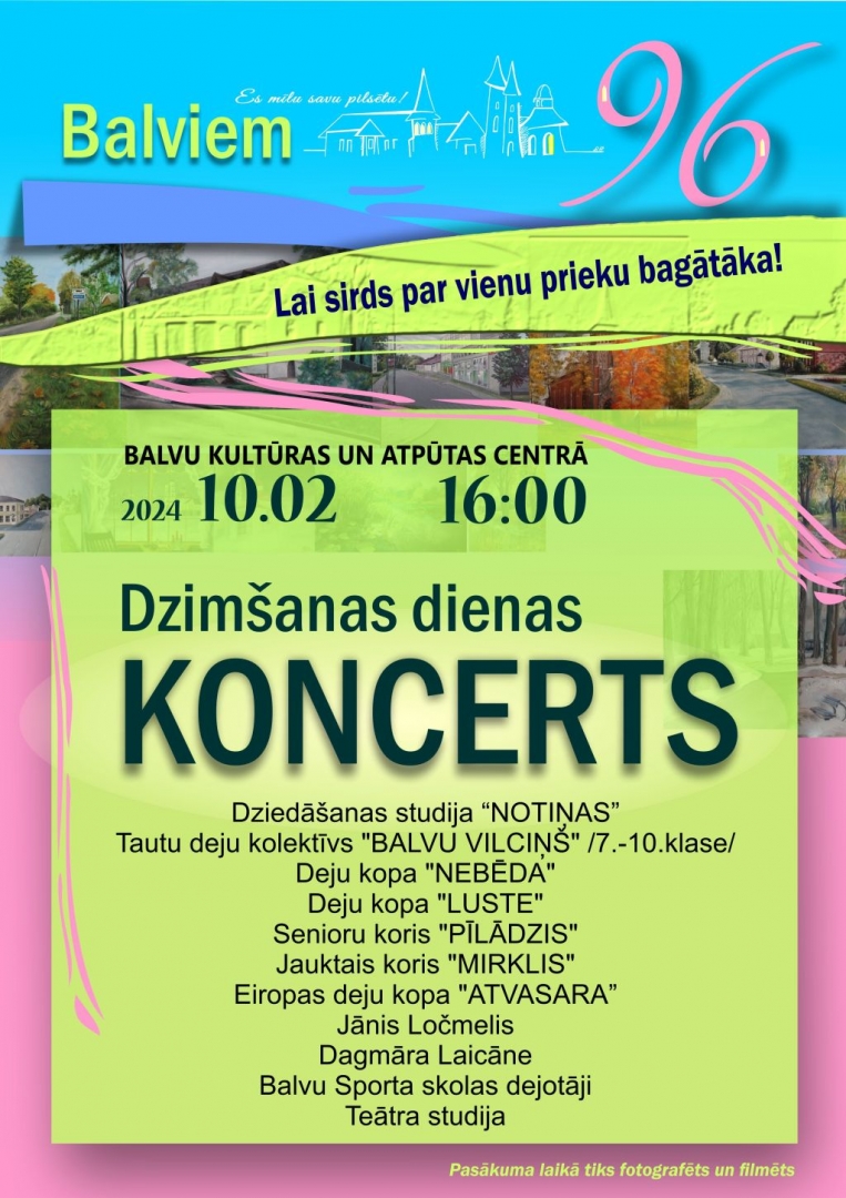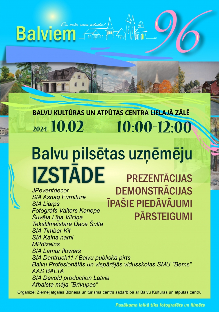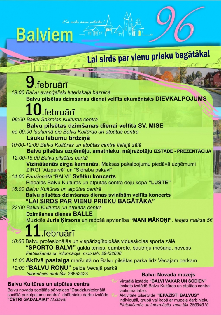 Aicinām uz Balvu pilsētas 96. dzimšanas dienas pasākumiem – trīs dienas pilnas aizraujošu iespēju novērtēt Balvu iedzīvotāju aizraušanos un piedalīties brīnišķīgās aktivitātēs. Izbaudi Balvu Kultūras un atpūtas centra pašdarbnieku koncertu, ielūkojies uzņēmēju, amatnieku un mājražotāju izstādē, baudi Lauku labumu tirdziņu, piedalies dažādās sportiskās aktivitātēs, kā arī kopā ar vietējiem mūziķiem - muzikālo apvienību “Mani mākoņi” un Juri Ķirsonu - svini svētkus.