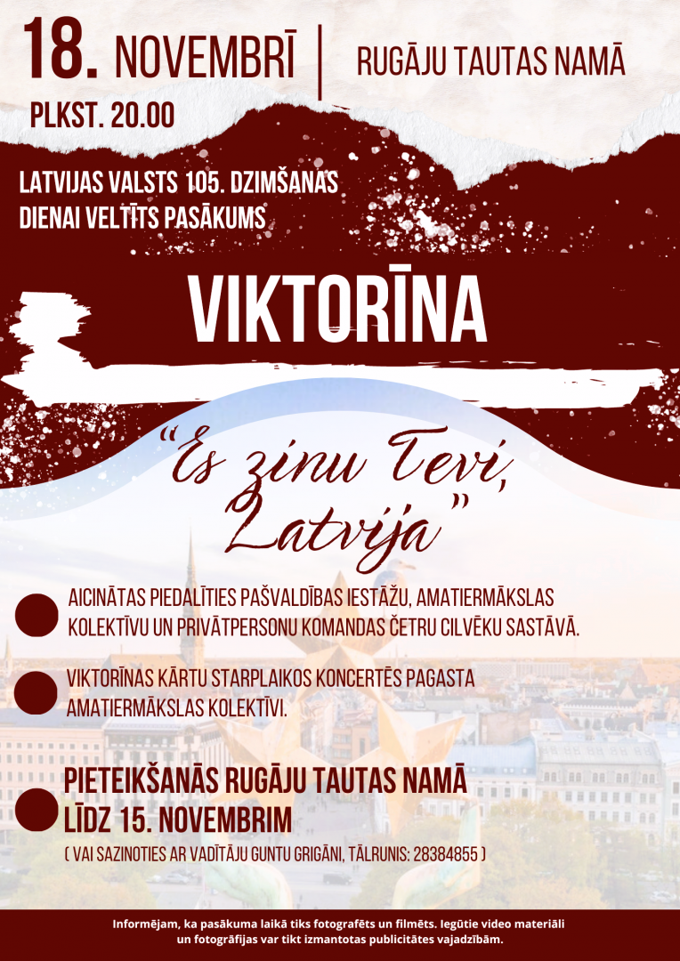 - Plkst. 20.00 Latvijas valsts 105. dzimšanas dienai veltīts pasākums: viktorīna “Es zinu Tevi, Latvija”. Aicinātas piedalīties pašvaldības iestāžu, amatiermākslas kolektīvu un privātpersonu komandas 4 cilvēku sastāvā. Pieteikšanās Rugāju Tautas namā līdz 15. novembrim. Viktorīnas kārtu starplaikos koncertēs pagasta amatiermākslas kolektīvi.