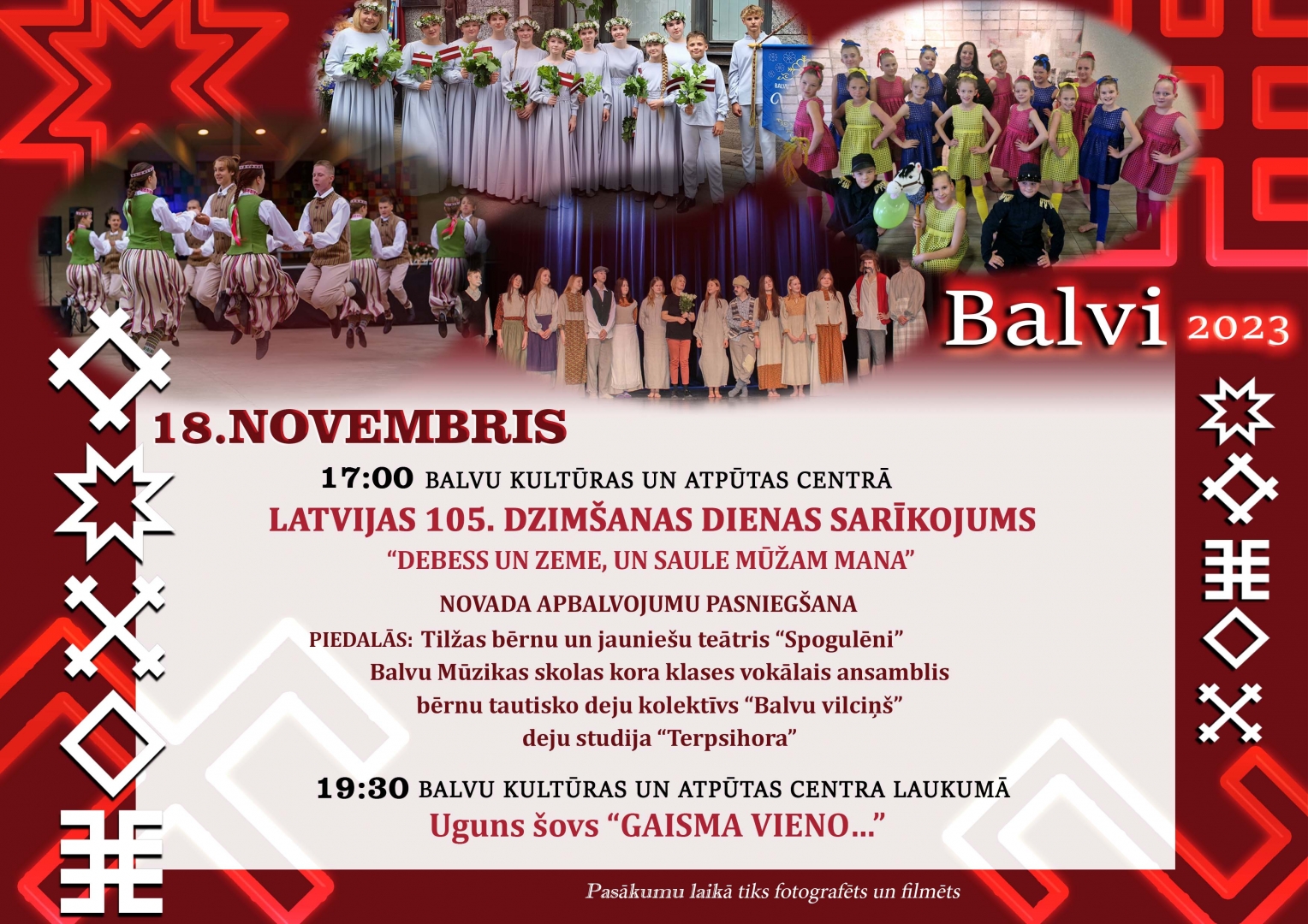 - No plkst. 17.00 - 19.30 Latvijas 105. dzimšanas dienas sarīkojums - novada apbalvojumu pasniegšana. Koncerts ”Debess un zeme un saule mūžam mana” Piedalās: Tilžas bērnu un jauniešu teātris “Spogulēni”, Balvu Mūzikas skolas kora klases vokālais ansamblis, bērnu tautisko deju kolektīvs “Balvu vilciņš”.