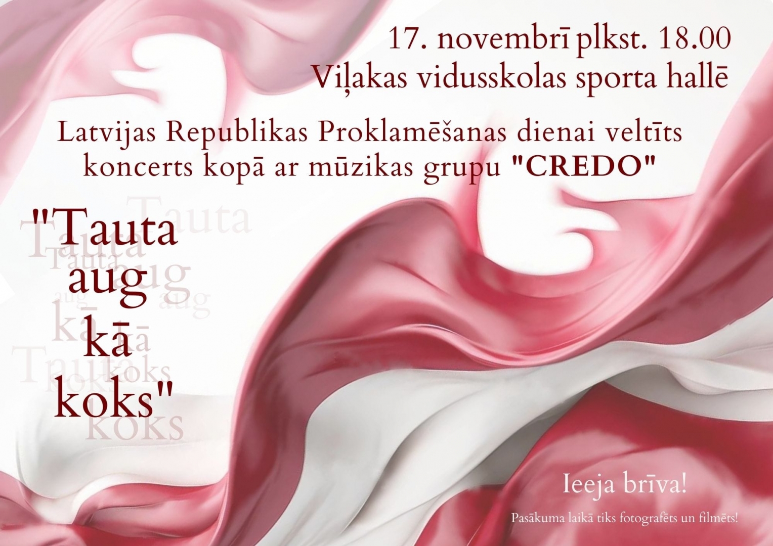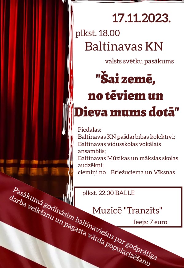 - Plkst.18.00 valsts svētku pasākums ”Šai zemē, no tēviem un Dieva mums dotā”.