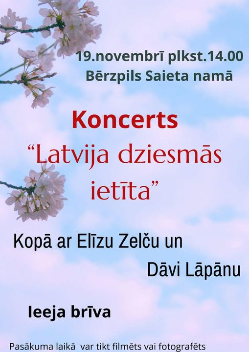 - Plkst. 14.00 koncerts ”Latvija dziesmās ietīta” kopā ar Elīzu Zelču un Dāvi Lāpānu (ieeja: brīva).