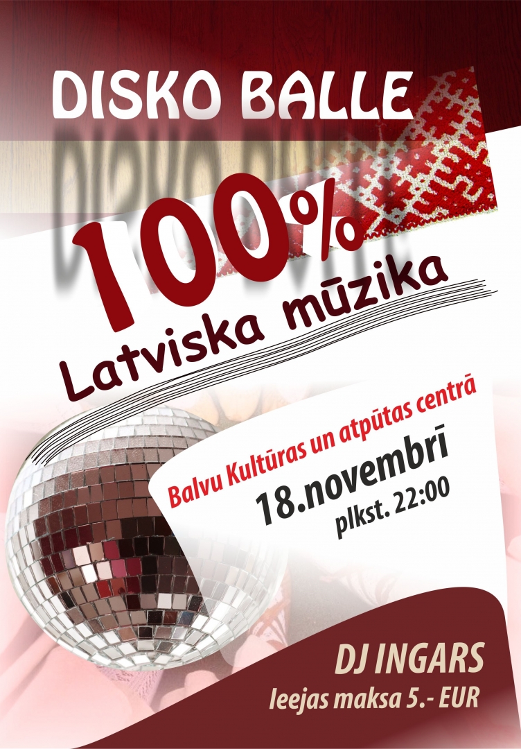 - Plkst. 22.00 Disko balle ”100% latviska mūzika” DJ Ingars (ieeja 5,00 euro).