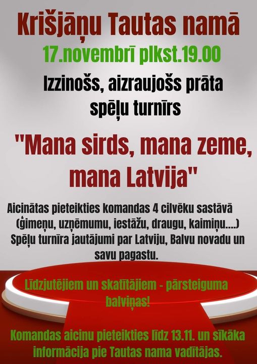 - Izzinošs un aizraujošs prāta spēļu turnīrs ''Mana sirds, mana zeme, mana Latvija''. Komandām lūgums pieteikties līdz 13. novembrim (4 cilvēku sastāvā).