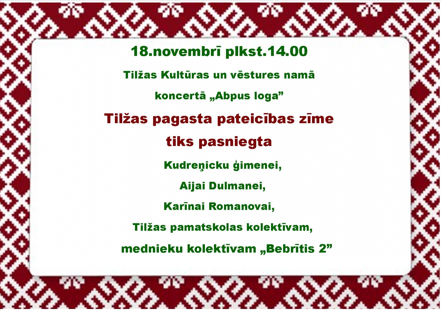 - Plkst.14.00 valsts svētku pasākums ''Abpus loga'' - amatiermākslas kolektīvu koncerts un Tilžas pagasta pateicības zīmes pasniegšana pagasta iedzīvotājiem, pēc koncerta vēstures lappušu pāršķiršana pie tējas tases vēstures istabās.