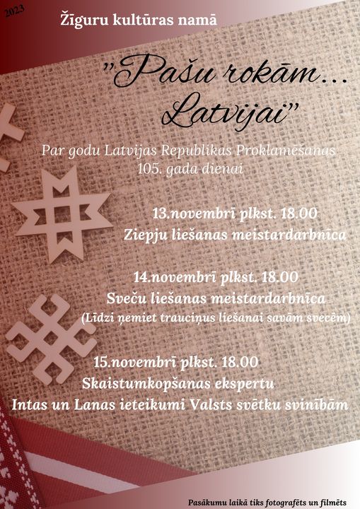 - Meistardarbnīca Valsts svētku ietvaros “Uztamborē savu svētku pīnīti Latvijai”. Veidosim kopēju valsts svētku noformējumu Kubulu pagastā - visi kopā pie siltas tējas tases.