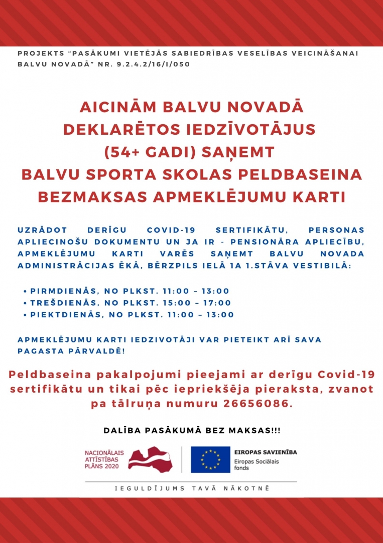 Uzrādot derīgu Covid-19 sertifikātu, personas apliecinošu dokumentu un ja ir – pensionāra apliecību, apmeklējumu karti varēs saņemt Balvu novada administrācijas ēkā, Bērzpils ielā 1A 1.stāva vestibilā: