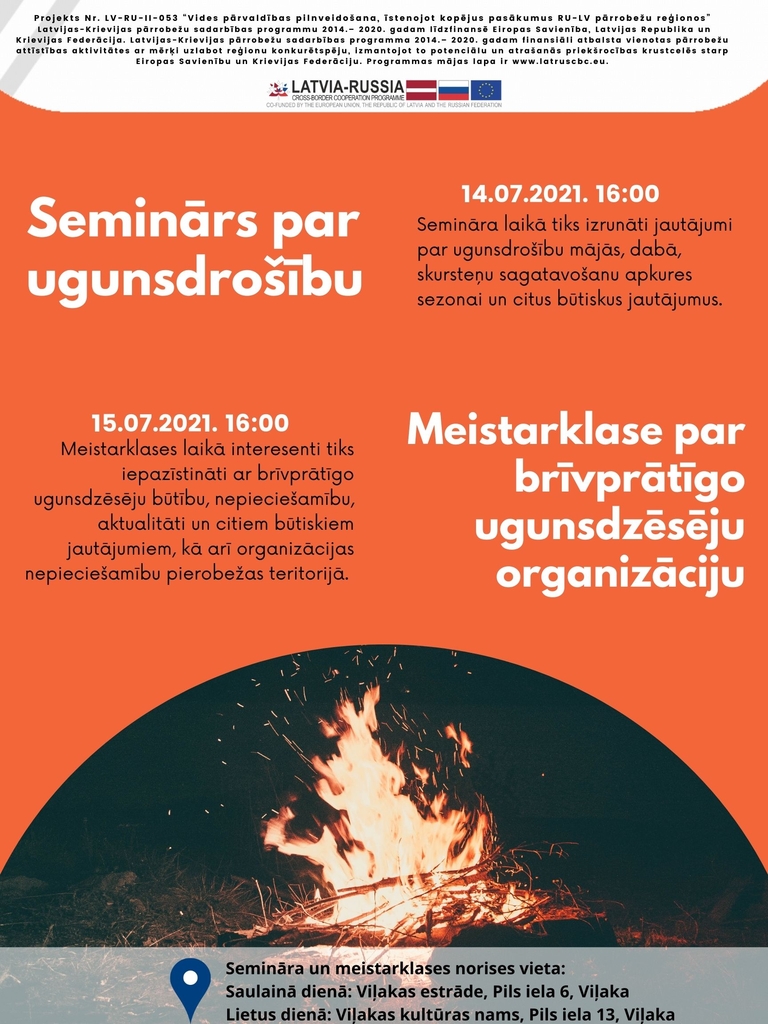 14.jūlijā plkst.16:00 visi interesenti tiek aicināti uz semināru par ugunsdrošību. Semināra laikā tiks izrunāti jautājumi par ugunsdrošību mājās, dabā, skursteņu sagatavošanu apkures sezonai un citus būtiskus jautājumus.