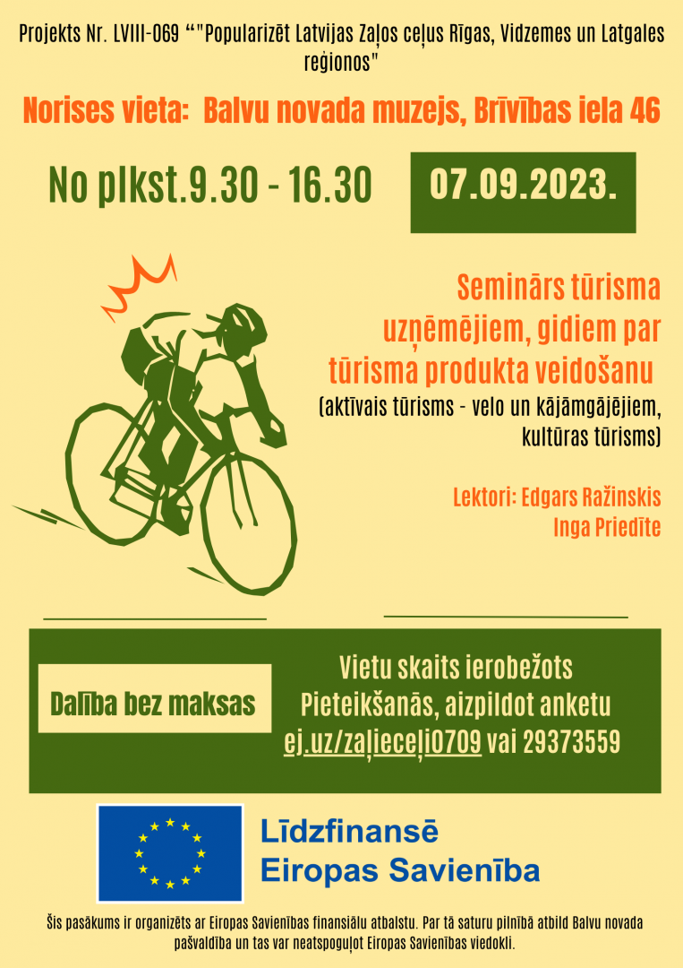 - Vietu skaits ierobežots Pieteikšanās, aizpildot anketu ej.uz/zaļieceļi0709 vai 29373559.