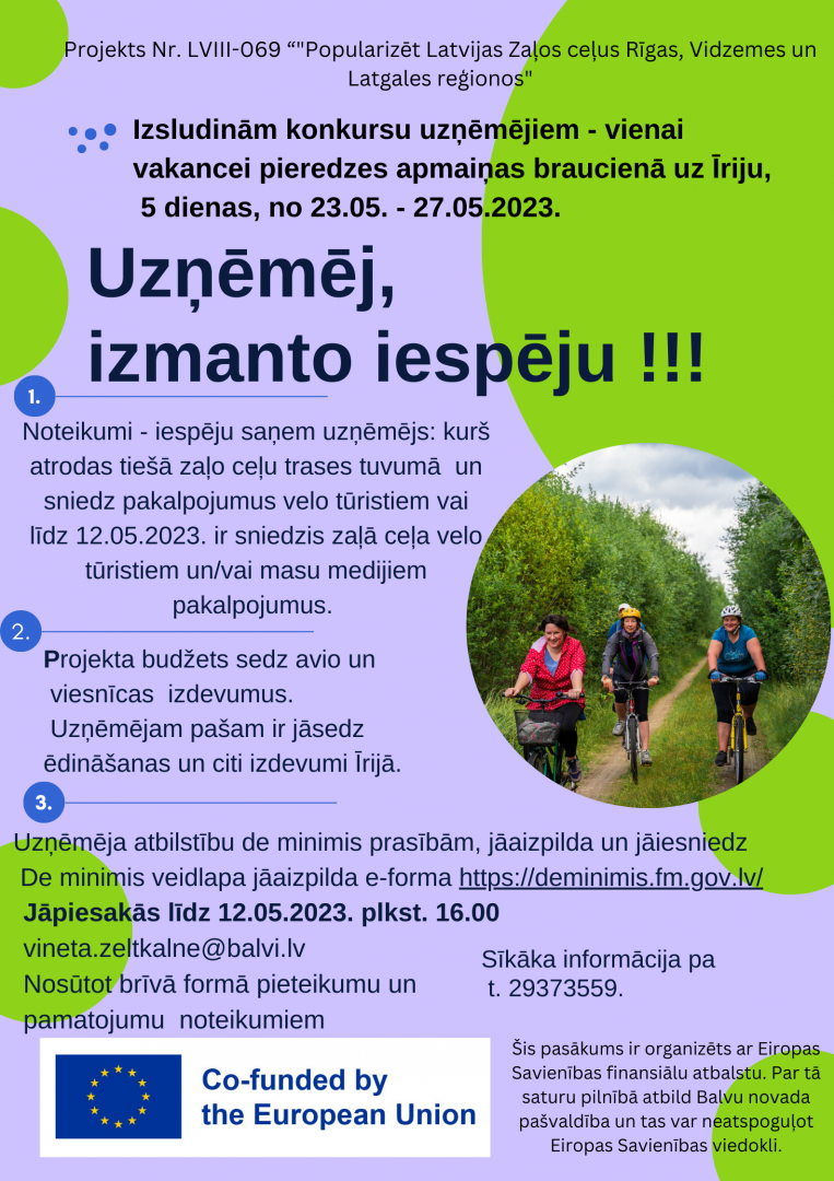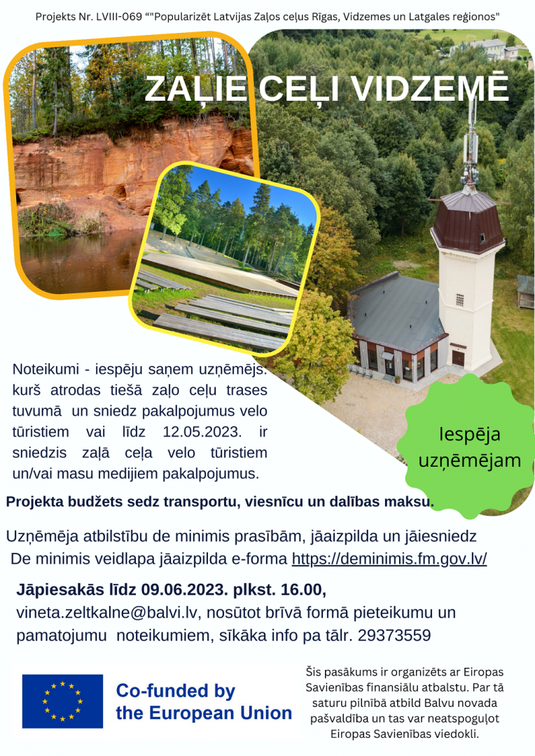 Balvu novada pašvaldība informē, ka no 2023.gada 16.aprīļa līdz 15.novembrim īstenos projektu Nr. LVIII-069 “"Popularizēt Latvijas Zaļos ceļus Rīgas, Vidzemes un Latgales reģionos" (akronīms: “Latvijas zaļie ceļi”) - Nr. LVIII-069 “Promote the green tourism routes of Riga, Vidzeme and Latgale regions” (acronym: “Greenways of Latvia”)