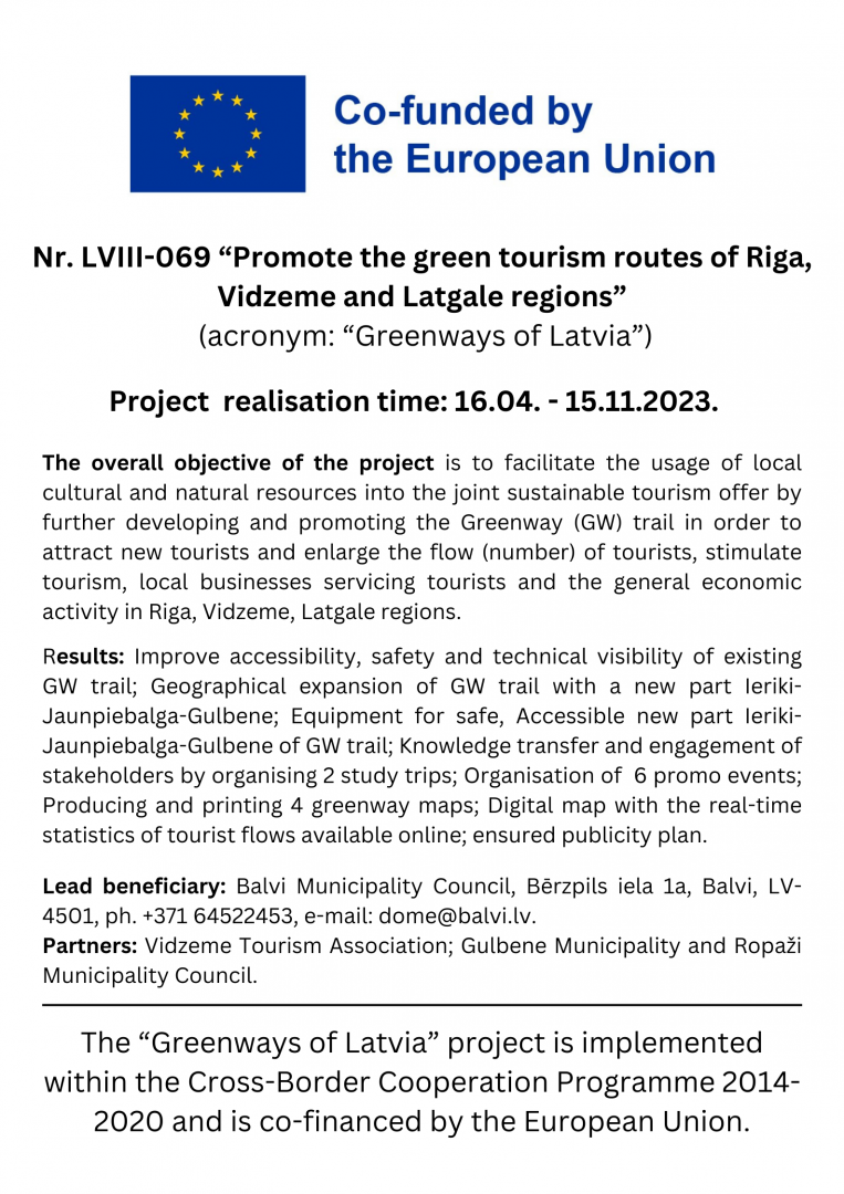 Projekts “Greenways of Latvia” (“Latvijas zaļie ceļi”) tiek īstenots pārrobežu sadarbības programmas 2014.-2020.gadam ietvaros un to līdzfinansē Eiropas Savienība.