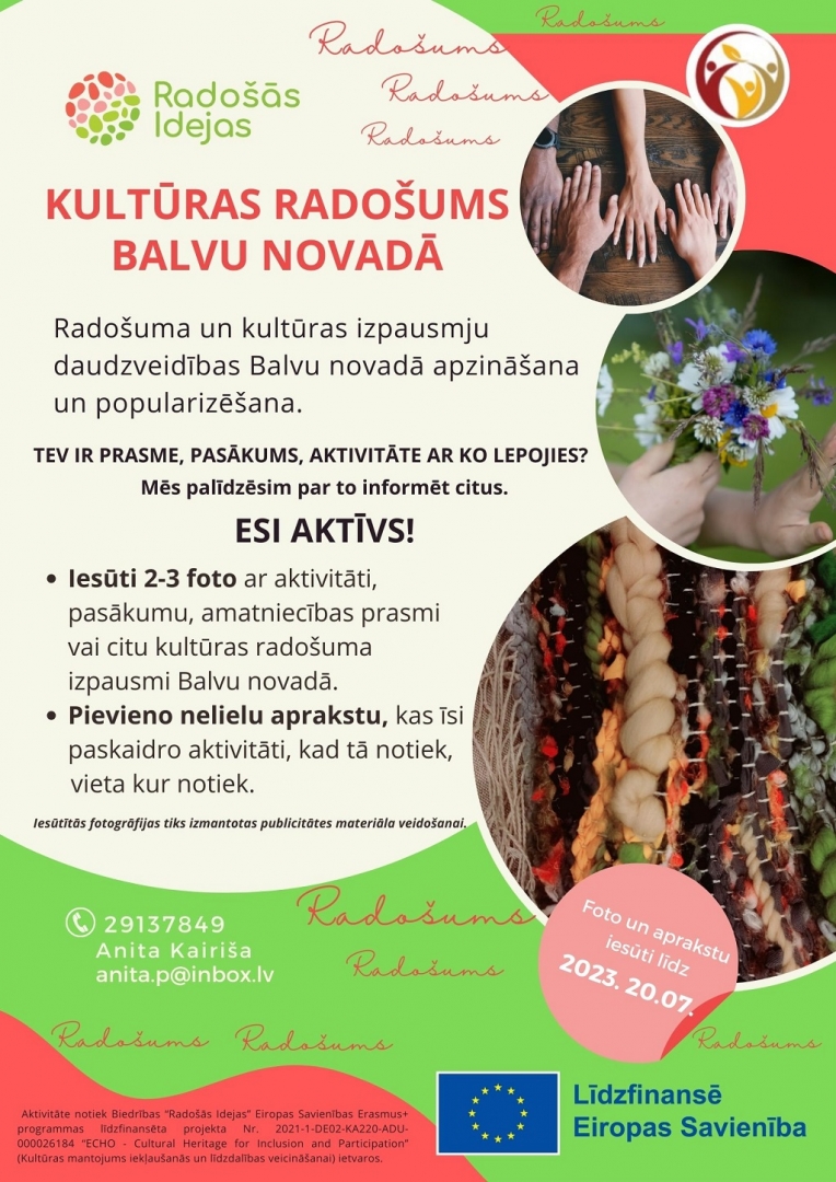 Biedrība “Radošās Idejas” AICINA būt aktīviem un lepoties ar radošumu un kultūras izpausmju daudzveidību Balvu novadā. Ja TEV ir prasme, aktivitāte, pasākums ar ko lepojies vai ir zināmi aktīvi kultūras prasmju, pasākumu organizatori, par ko jāzina sabiedrībai, padalies ar skaistiem foto un nelielu aprakstu un mēs palīdzēsim par to informēt citus vietējā, nacionālā un starptautiskā līmenī!