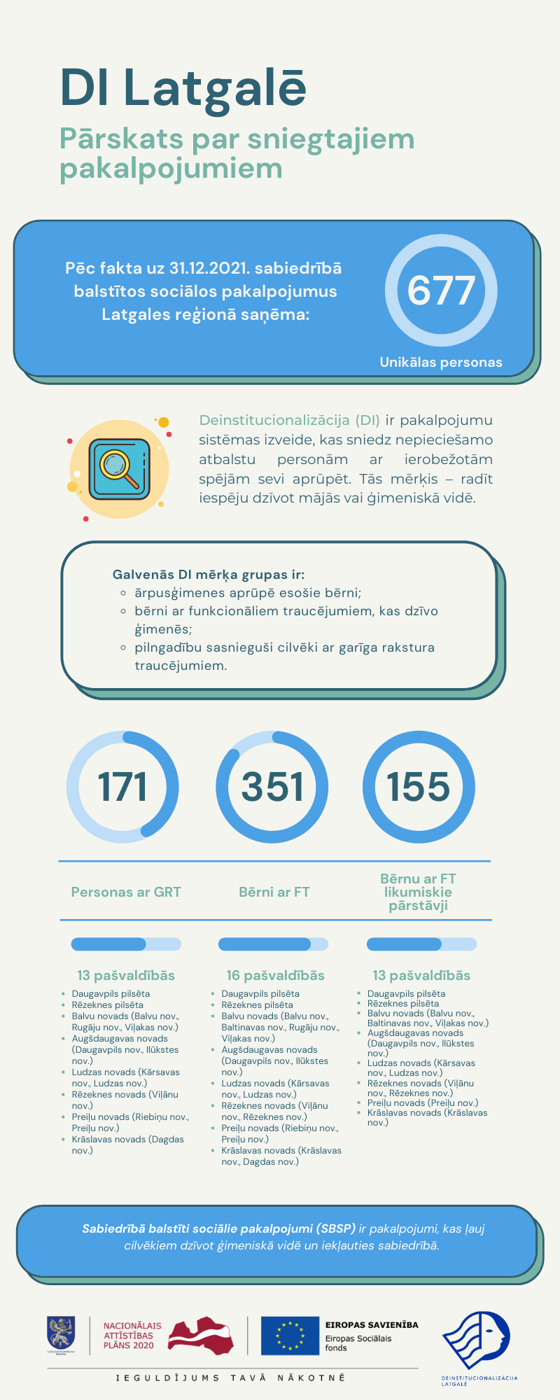 Izvērtējot pakalpojumus saņēmušo bērnu skaitu attiecībā pret kopējo pašvaldībās izvērtēto bērnu ar FT skaitu, novērojams, ka Preiļu novadā pakalpojumus saņēmuši 17% izvērtēto bērnu, 2 pašvaldībās (Baltinavas novads un Rēzeknes novads) pakalpojumus saņēmuši aptuveni 30%-40% bērnu, 4 pašvaldībās (Rugāju, Krāslavas, Balvu un Viļakas novadi) pakalpojumus saņēmuši 40-60% no izvērtētajiem bērniem. 100% izvērtēto bērnu saņēmuši pakalpojumus Riebiņu novadā, savukārt Daugavpils pilsētā un Daugavpils novadā kopumā pakalpojumus saņēmuši vairāk nekā 100% bērnu. Tas ir izskaidrojams ar to, ka sociālās aprūpes pakalpojumu var saņemt arī tie bērni, kuri nav izvērtēti DI projekta ietvaros, bet kuriem izsniegts VDEĀK atzinums par īpašas kopšanas nepieciešamību. Pārējās pašvaldībās pakalpojumus uzsākuši saņemt 70-80% izvērtēto bērnu. Tikai Aglonas, Zilupes un Vārkavas novada pašvaldībās līdz 2021. gada beigām bērni ar FT pakalpojumus vēl nebija uzsākuši saņemt.