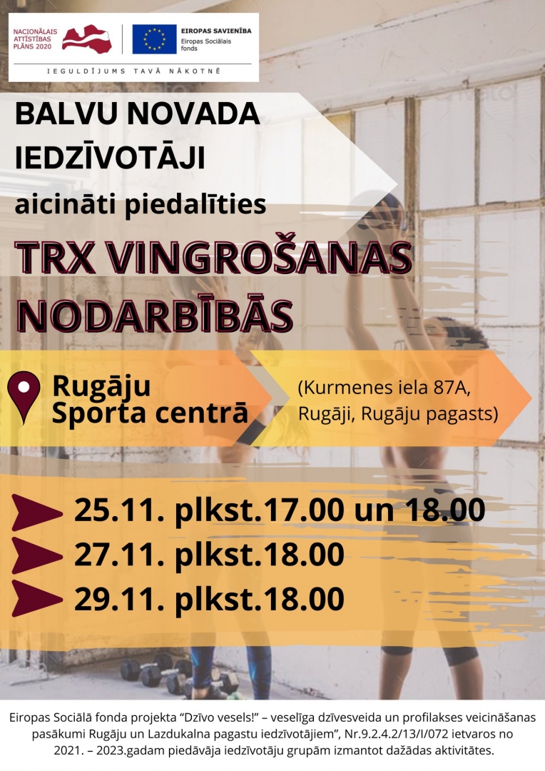 Eiropas Sociālā fonda projekta “Dzīvo vesels!” – veselīga dzīvesveida un profilakses veicināšanas pasākumi Rugāju un Lazdukalna pagastu iedzīvotājiem”, Nr.9.2.4.2/13/I/072 ietvaros no 2021. – 2023.gadam piedāvā iedzīvotāju grupām izmantot dažādas aktivitātes.